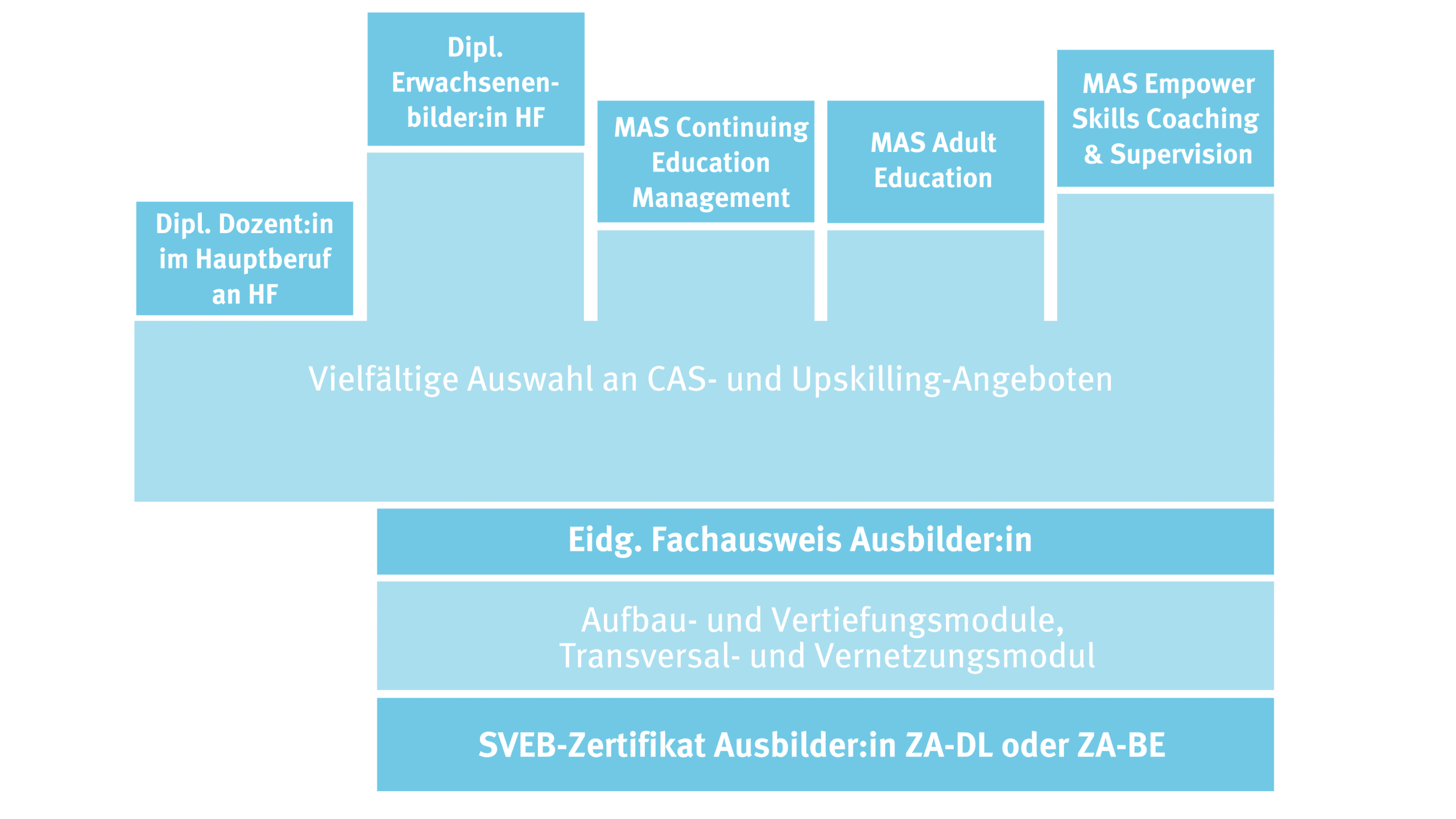 Zusätzlich bieten wir für einen gelingenden Start in die Erwachsenen- und Berufsbildung die Grundlagenmodule SVEB-Zertifikat Ausbilder ZA-DL und SVEB-Zertifikat Ausbilder ZA-BE an. Auf der Stufe 2 stellen wir Ihnen unser umfassendes Angebot zur Verfügung, das Sie auf Ihrem Weg zum eidg. Fachausweis Ausbilder:in begleitet: Das Aufbaumodul Didaktik FA-AMD befähigt Sie, Lernveranstaltungen zu konzipieren und didaktisch fundiert zu gestalten. Im Aufbaumodul Begleitung FA-AMB erweitern und stärken sie Ihre Kompetenzen, Lerngruppen und Einzelpersonen gezielt in ihrem Lernen zu unterstützen. Im Vertiefungsmodul FA-VM-GR begleiten Sie als Leitungs- und Fachperson Gruppenprozesse und fördern nachhaltiges Lernen sowie die persönliche Entwicklung Ihrer Lernenden und Mitarbeitenden. Ab 2025 können Sie das Transversal- sowie Vernetzungsmodul besuchen, welche zur individuellen Weiterentwicklung Ihrer Handlungskompetenzen als Ausbilder:in und/oder Führungskraft beitragen.
